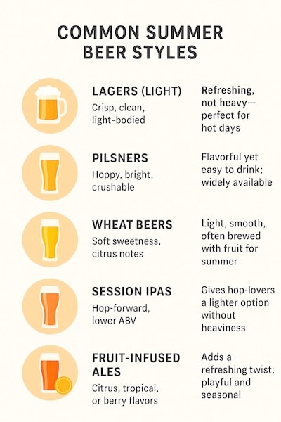 Beers with citrus and fruit-forward flavor profiles are ideal as they provide a flavor boost without needing a fuller body. And finally, a crisp finish is absolutely necessary. Anything too sweet or bitter won’t give you the refreshment your body craves during warm weather.